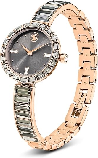 The 25mm stainless steel design has a rose gold-tone finish and is encircled by a bezel with 20 baguette-cut dark gray crystals, while a single crystal is set within the crown