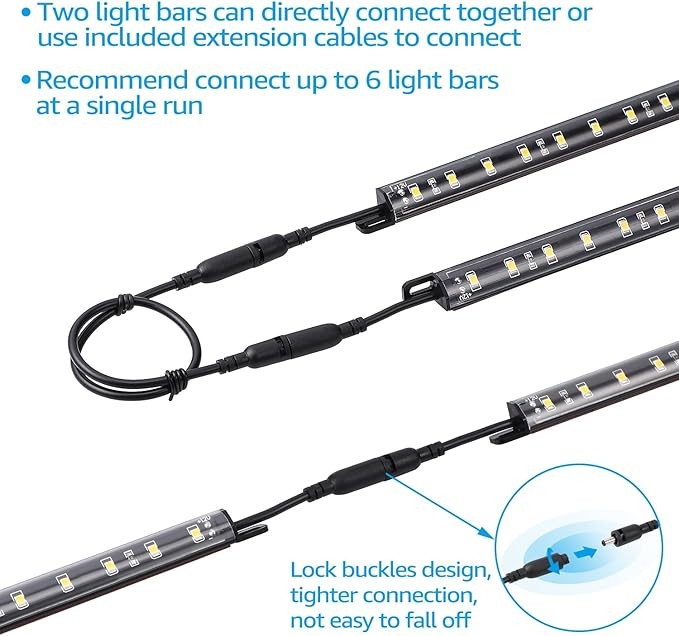 NOTE: If you replace the included power adapter with a higher wattage power adapter, you could connect 8 to 10 light bars together. It is not recommended to connect 12 light bars because the one connected at the end may not be bright enough