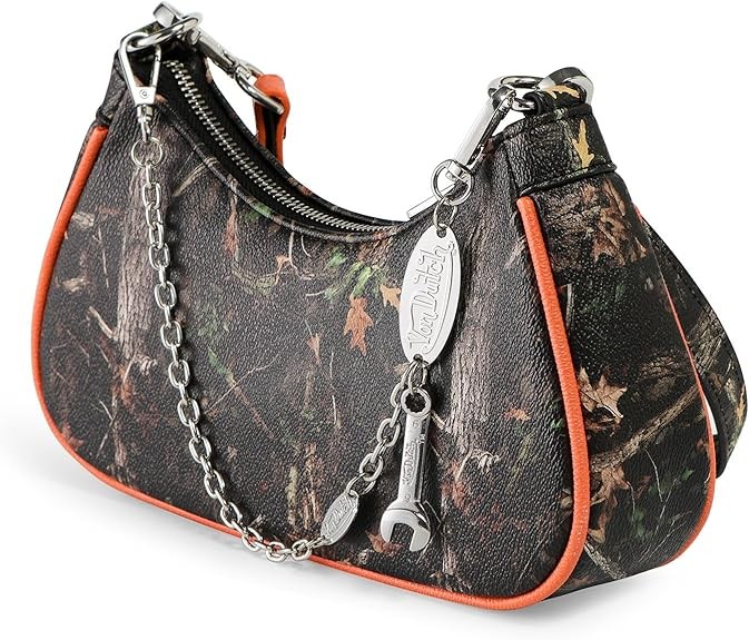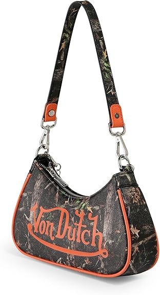 Iconic Von Dutch Bag: A small shoulder handbag for the ages. Classic Von Dutch logo emblazons the front of the tree camo purse. Bright orange trim and large orange logo draw the eye and complement the camouflage background