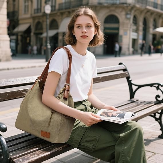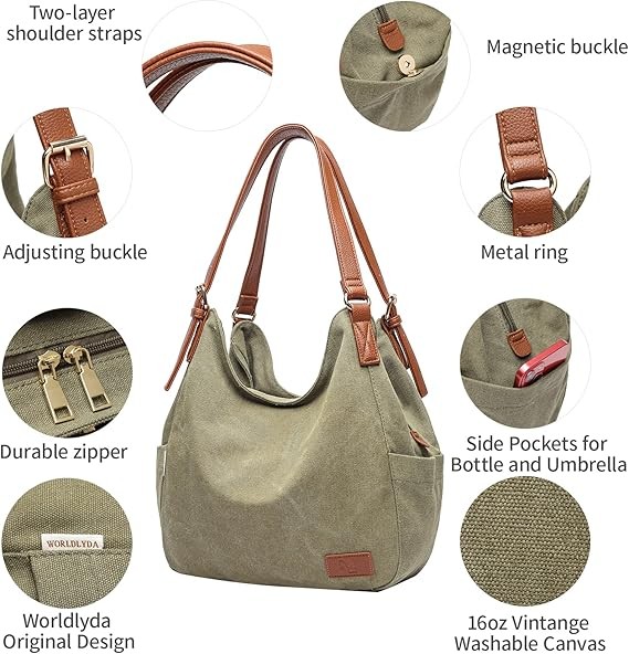 DURABLE MATERIALS AND LARGE DIMENSION:high density 100 % 16 oz washable cotton canvas hobo Tote purse; breathable polycotton lining; high quality PU leather; durable magnetic button and smooth zipper. Approx. 11.8 x 13.3 x 4.7 inches. Straps: Height: 10.5 inches; Around 1.47 pounds