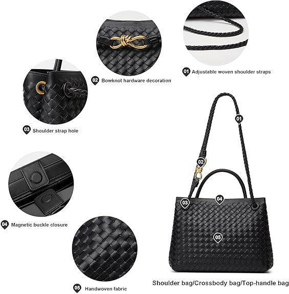 Woven Bags for Women: This small woven tote bag is made of vegan leather. It is very soft , comfortable to touch and easy to wipe clean. The adjustable strap is very easy to rest it on your shoulder. Womens must have woven handbag with bowknot for your daily leisure, relaxing vacations.