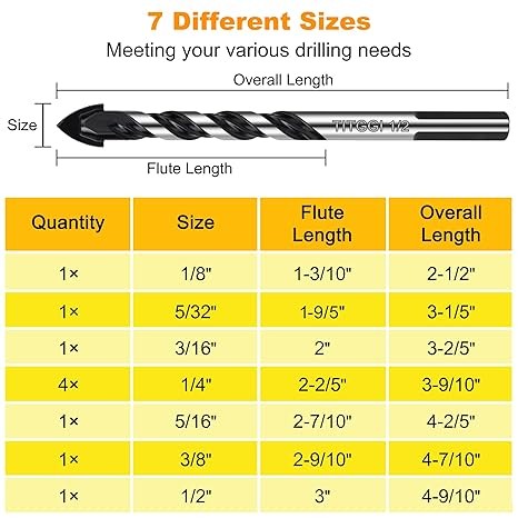 HIGH QUALITY DRILL BIT SET; TITGGI Masonry drill bit set, industrial strength carbide drill bit tip, excellent abrasion resistance, make the drilling much more easier. this cement drill bits can easily penetrate various material (glass, ceramic, cement, wood, brick, travertine, hard plastic, etc.)