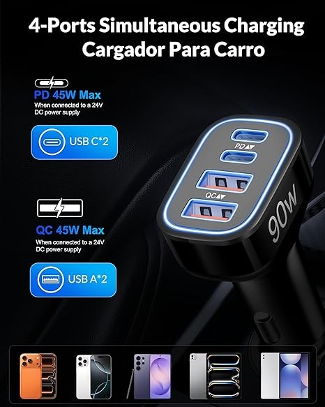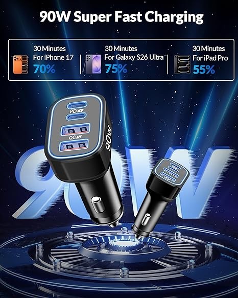 90W Super Fast Charging: The cigarette lighter adapter total output 90W, can be used with DC12-24V and the single port has a maximum power output of up to 45W (requires the car phone charger output voltage to be 24V). It can charge 70% for iPhone 17 16 15 series and 75% for Samsung Galaxy S26 S25 S24 series in 30 minutes, also provide fast charging for your MacBook/Laptop