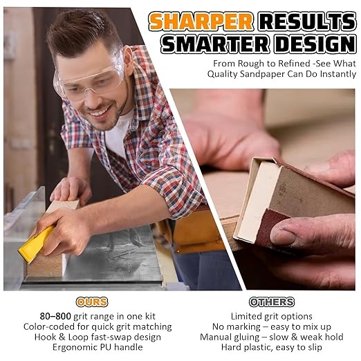 Smart 3-Color Grit System: Identify coarse, medium, or fine grit in seconds with the intuitive 3-color-coded system – no more sanding errors.