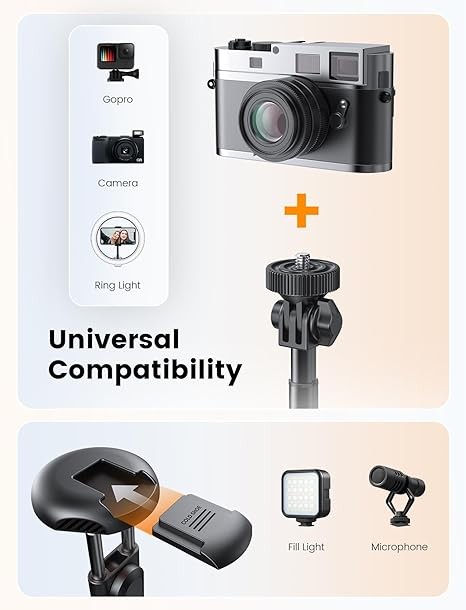【Universal Compatibility for Phones & Cameras】Easily switch between your smartphone, camera, or GoPro with the 1/4" screw mount of tripod for cell phone . The secure phone clamp of selfie stick tripod with remote fits phones from 4"-7" and includes a cold shoe for accessories like microphones or lights, making the professional video accessories cell phone tripod stand ideal for video shooting, live streaming, and vlogging. Note: Rotate clamp horizontally first for vertical phone mounting.