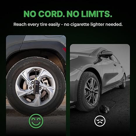 AUTO SHUT OFF: Use the “+” and “-” control buttons on the Airmoto to easily select your desired pressure, simply connect the air hose to your car and press the middle “Start” button on the electric air pump. Once the correct pressure has been reached the Airmoto will automatically shut off. The cordless car tire pump makes it easy to reach all tires without a hassle.