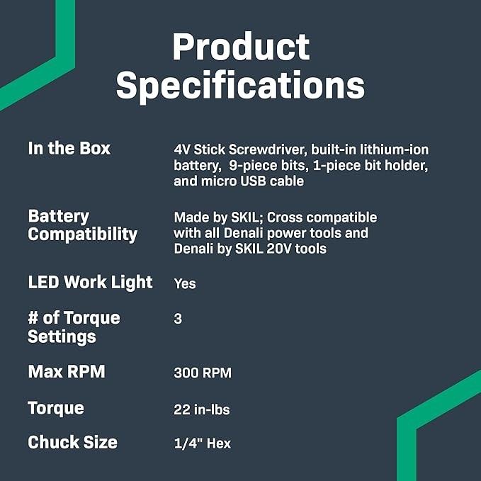 Amazon Basics by SKIL 4V Cordless Stick Screwdriver with 10-Piece Bit Set, USB Cable, LED Light, 3 Torque Settings