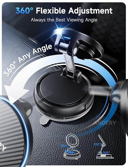 360° Rotation & Dual-Axis Adjustment:This car phone holder features a 360° rotating base and 210° dual-axis folding metal arms, allowing easy angle adjustments to suit your needs. Whether in the car or at the office, switch between portrait and landscape modes effortlessly. Its unique folding design reduces the mount's size by 50% when not in use, keeping your space tidy. It stays smooth and dependable for everyday use.