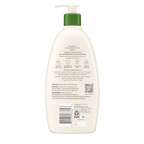 SENSITIVE SKIN: Aveeno Daily Moisturizing Lotion with prebiotic oat is clinically proven to moisturize for 48 hours with a non-greasy feel; gentle enough to use within your daily skincare routine