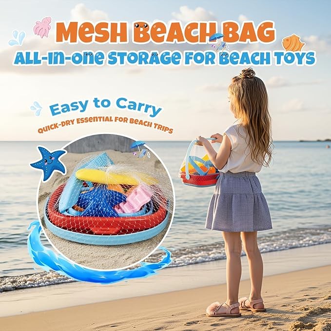 All-in-One & Well-Organized Sand Toys Kit The set comes with a collapsible bucket, shovel, rake, multiple fun sand molds, and a breathable mesh storage bag. Everything stays neatly organized—no more scattered toys or messy cleanups. Lightweight and easy to carry for on-the-go fun.