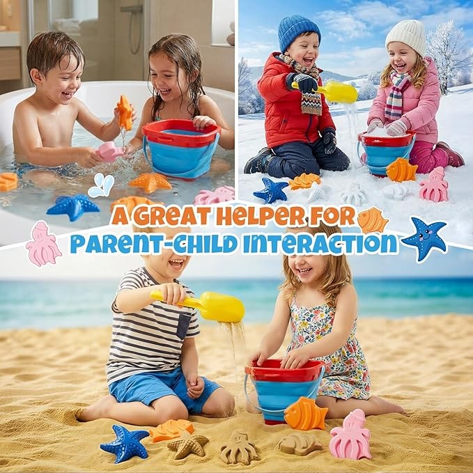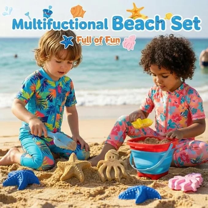 Foldable & Space-Saving Design This collapsible beach toys set includes a foldable sand bucket that expands instantly for play and folds flat to a slim size—taking up minimal space in suitcases or car trunks. Ideal travel beach toys for family beach trips, weekend getaways, and summer vacations.