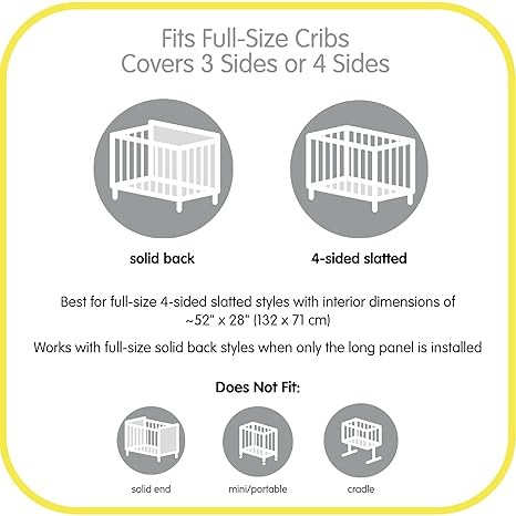 FITS FULL-SIZE STYLES WITH A 52" x 28" (132 CM x 71 CM) MATTRESS: Install long 11" x 111" (28 cm x 282 cm) and short 11" x 82" (28 cm x 208 cm) panels to cover 4 sides or only the long panel to cover 3 sides. Do not use on solid end styles or mini cribs.