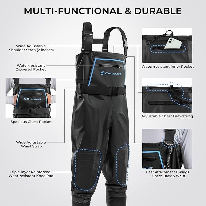 Enhanced Comfort & Durability: The Calamus Chest Waders provide a soft, skin-friendly feel for all-day comfort. With twice the tear resistance of competitors, they offer exceptional durability to withstand rugged outdoor conditions. The triple-layer reinforced knee pads add extra protection and abrasion resistance, ensuring long-lasting performance on any fishing trip