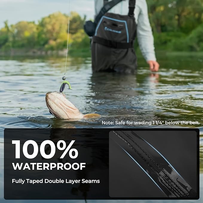 100% Waterproof: Constructed from durable nylon with a PVC membrane, the Calamus WaveWalker Fishing Waders deliver complete waterproof protection. The durable water repellent (DWR) finish enhances moisture resistance, while reinforced taped seams provide an extra layer of defense, ensuring the waders do not leak