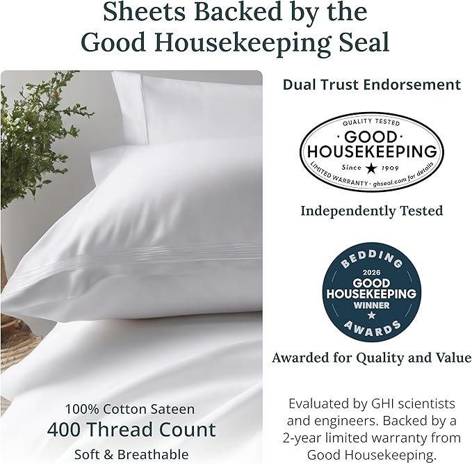 Winner of the 2026 Good Housekeeping Best Bedding Award - Everyday Ease Cotton Sheets: Our 400 thread count queen size bed sheets are made with single-ply 100% long-staple cotton for a smooth hand feel and lightweight comfort. Independently tested to earn the prestigious Good Housekeeping Seal.