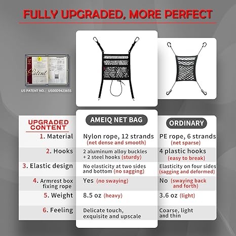 This Car Net Pocket Bag is Made of High-quality Materials: It has 4 metal fasteners, the upper 2 carabiners are aluminum alloy, and the below 2 hooks are nickel plated steel; The Mesh Material of This Car Organizer is Super Strong Performance: High quality nylon, inelastic, the net bed made of it can bear the weight of 6 adults;