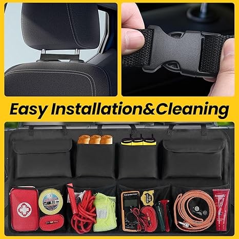 EFFORTLESS INSTALLATION & REMOVAL— Install this Trunk Organizer for SUV & Car in under 3 minutes with three adjustable buckle straps and a secure Velcro base, preventing unwanted movement on bumpy roads. When not in use, simply detach the Backseat Hanging Grocery Organizer and fold compactly for storage in Trucks & Vans.