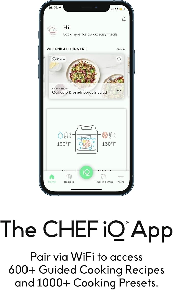 THE CHEF iQ APP: Connect to our free app via WiFi and Bluetooth and access hundreds of Guided Cooking recipes and culinary how-to videos, control and monitor your Smart Cooker, and access hundreds of presets for almost any ingredient