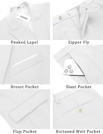Classic Design: The suit jacket includes 2 flap pockets, 1 inner pocket, and 1 chest pocket. Structured shoulder pads and side vents ensure a sharp fit. The suit pants have a button-zip fly and an elastic waistband for a comfortable fit on all body types