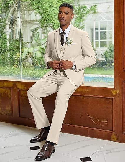 【3 Piece Suits】- 2 button blazer regular fit, lapel tuxedo, 2 front flap pockets and 2 inner pockets, four button cuffs with one chest pocket, naturally shaped and soft shoulder pads. Flat front design suit pants with elasticated bands, zipper design, mens suit vest with five buttons, two side pockets, v-neck, classic suit for men