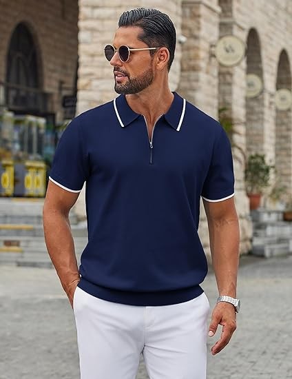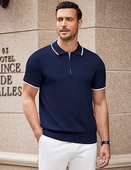 MEN'S KNIT POLO SHIRT: Coofandy men's polo shirt designed with delicate 1/4 metal zipper, stripe, knit, turndown collar,high elastic banded cuffs and hem can made you feel stylish and modern.