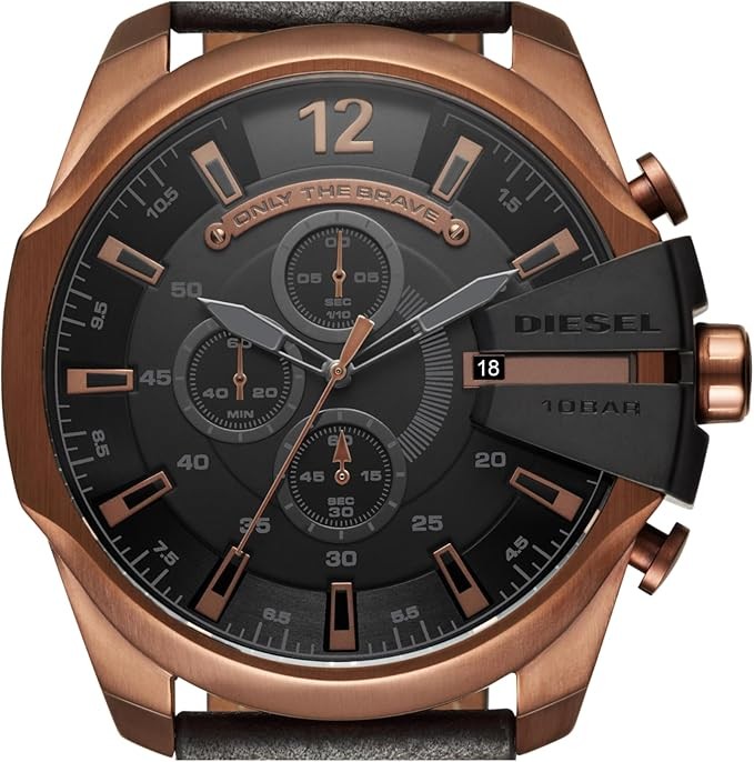 THE WATCH SAYS IT ALL: Only The Brave; when you wear those words featured on the Mega Chief Diesel watch chronograph dial, you show the world how you live each minute; in fact, the watch's three sub-dials track minutes, seconds, and tenths of seconds