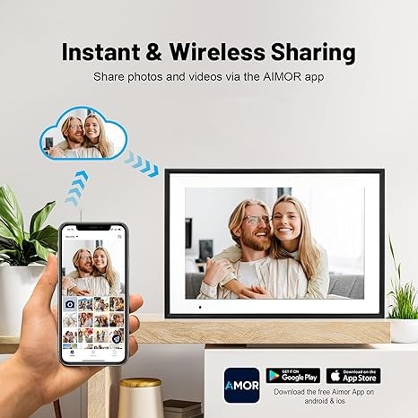 WIRELESS SHARING VIA APP: App "AiMOR" can work on both Android & iOS phones. You can download it from Google play or App store and connect it with your Anna Bella WiFi digital picture frame. Once done, you are allowed to share photos or short videos (Up to 15sec.) with your loved ones via App for lifetime with zero subscription fee. This electronic picture frame has a variety of customized settings to meet kinds of your needs, such as slideshow, timer, zoom & crop, sleep mode and more!