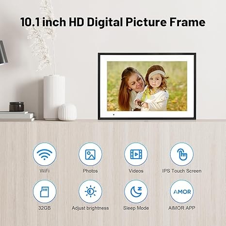 Digital Picture Frame 10.1 Inch WiFi Digital Photo Frame IPS HD Touch Screen Smart Cloud Photo Frame with 32GB Storage, Auto-Rotate, Easy Setup to Share Photos or Videos Remotely via AiMOR APP (Black)