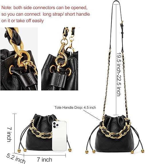 Drawstring Purse Size: 7" L* 7" H* 5.2" W Inch (Small Bucket Purse). Net Weight Only About 0.6 KG/ 1.33 LB. Short Strap Handle Drop: 4.5" Inch. Long Strap Handle Drop: 19.5" ~22.5" Inch. Important Note: Both Sides Metal Connectors Can Be Opened. So You Can Connect Long Strap/ Short Metal Handle On It Or Take Off Both Easily