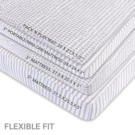 Flexible, Secure Fit – Featuring a fully elasticized, flexible-fit design, these sheets protect standard Pack and Play, Mini Crib, Portable Crib, and Playard mattresses up to 5” in height. Including Graco Pack n Play and Dream On Me Playard. Actual dimensions: 39” x 27” x 5”.