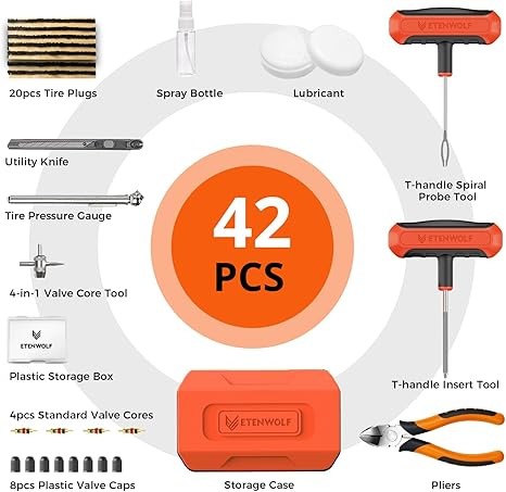 ETENWOLF Tire Repair Kit 42 Pcs, Heavy Duty Tire Plug Kit to Fix Punctures, Tire Repair Tool with Plugs for Car, Motorcycle, ATV, Jeep, Truck, Tractor, Gifts for Him Her Men Women, Vivid Orange