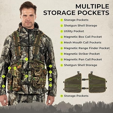 • Turkey-Ready Storage & Call Organization – Built for serious turkey hunters, the Extremus BearHauler Turkey Vest features two oversized rear pouches plus dedicated pockets for pot/pan calls, box calls, mouth calls, strikers, rangefinder, shotgun shells, hydration, and small accessories like your phone, license, and keys—so your gear stays organized and ready fast.