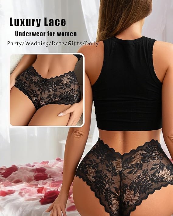 MULTI-PACK WITH A PROMISE -- Our 5 pack lace underwear for women that fit true-to-size. women lace underwear you can wear all day long. Elevate your lingerie collection with our exquisitely crafted lace accents. These beautiful trims add a touch of elegance and femininity to the overall design, making you feel confident and stylish. ideal for work, workouts, date nights, and casual wear.