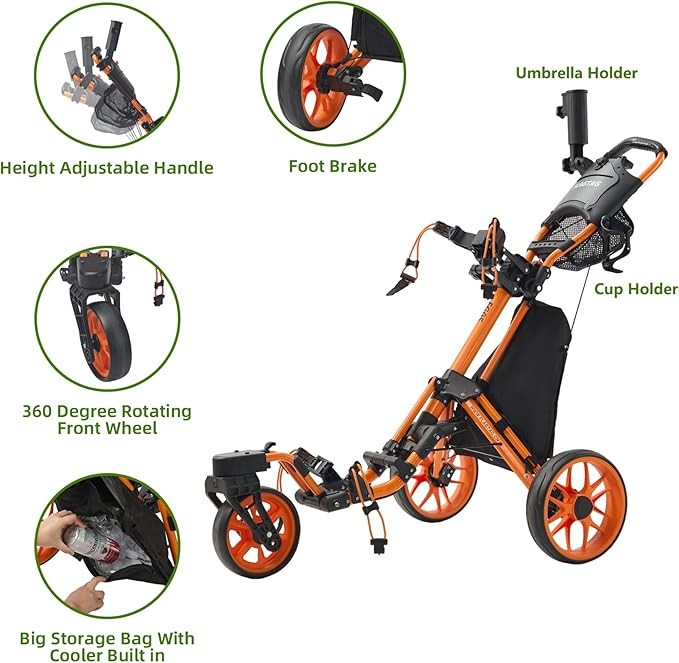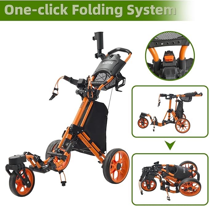 3 Wheel 360 Rotating Front Wheel Golf Push Cart: The cart with a front swivel wheel that rotates a full 360 degrees. Lightweight and durable design, Super sturdy and durabiliy ! The front wheel can automatically adjust direction according to different terrain !Traction and parking smoother !