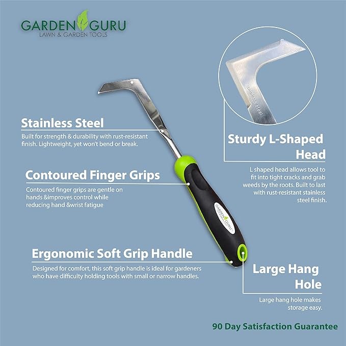 Stainless Steel for ultimate strength, this weeding tool is lightweight yet won't bend or break. L-shaped head allows tool to fit into tight cracks and grab weeds b the roots. Built to last with rust-resistant finish.