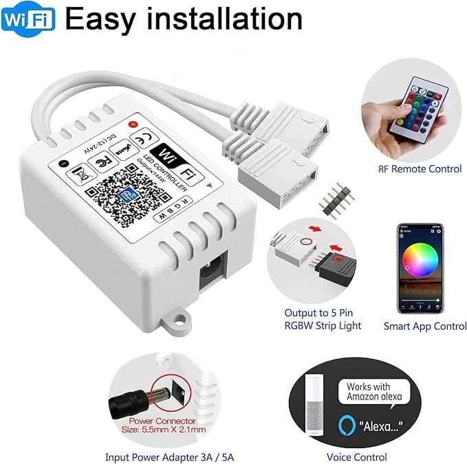 Compatible with Alexa & Google Assistant:Voice Control your 5 pins RGBW led light strip with Alexa or Google Assistant, turn on/off your light, changing/dimming brightness and colors.(Please install it after connect near your WiFi Router and reset it before use)