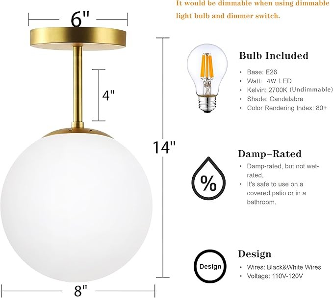 【Mid Century Modern Style Globe Ceiling Light】With Classic Mid Century Modern style, the polished brushed brass finish will maintain its color and anti-rust properties for many years. With an opal glass to elevate this unique ceiling light to luxury quality.