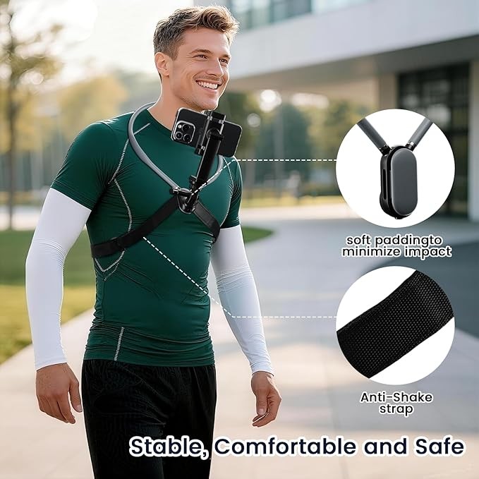 Equipped with Chest Strap:The included shock-absorbing chest strap adds extra stability, keeping your phone or camera steady even during high-intensity activities. It effectively reduces vibrations, delivering smoother footage and clearer images. Whether you're running, cycling, or hiking, the chest strap evenly distributes the weight across your chest, reducing neck strain. It's perfect for extended use, letting you focus on capturing perfect moments without worrying about shaky footage.