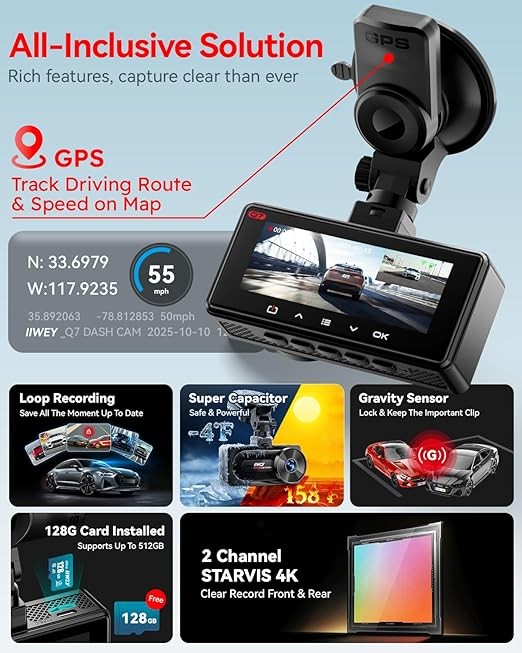 IIWEY 4K+4K Dash Cam Front and Rear, Dual STARVIS Sensor, 5G WiFi-6 (up to 20MB/s) with App, 128G SD Card Included, GPS, Dash Camera for Cars with 24/7 Parking Mode, 3.18 Inch IPS, 170° Wide Angle