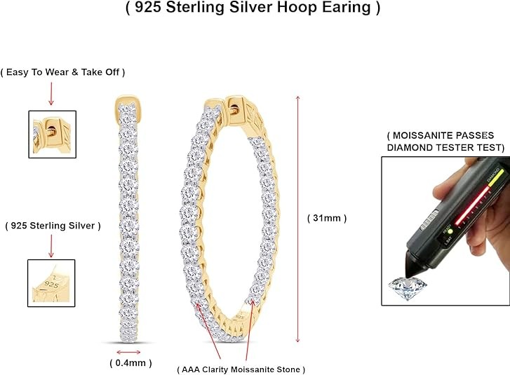 These elegant inside out hoop earrings for women feature round lab created moissanite or lab grown diamonds set along both the outer and inner curves, offering maximum brilliance from every angle. A timeless jewelry design that adds sparkle and sophistication to any outfit, these gold plated hoops make a stylish statement for weddings, parties, or everyday wear. Classic and modern, they’re perfect for women who love bold yet versatile fine jewelry.