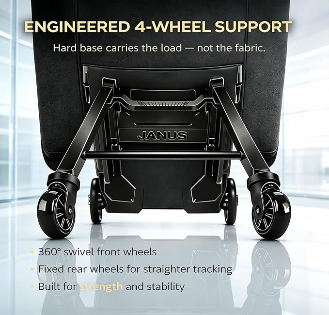360° SPINNER WHEELS + SUPPORT LEGS SYSTEM – SMOOTH AIRPORT MOBILITY Features smooth 360° spinner wheels and an integrated collapsible support legs system, allowing upright rolling and stable standing. Designed for airport movement, hotel corridors, and long-distance transport with better balance and control.