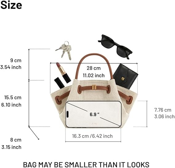 Please note: This mini tote bag may be smaller than it appears, with limited capacity for essentials such as a phone, lipstick, keys, and a wallet. Please check the size guide and model photos