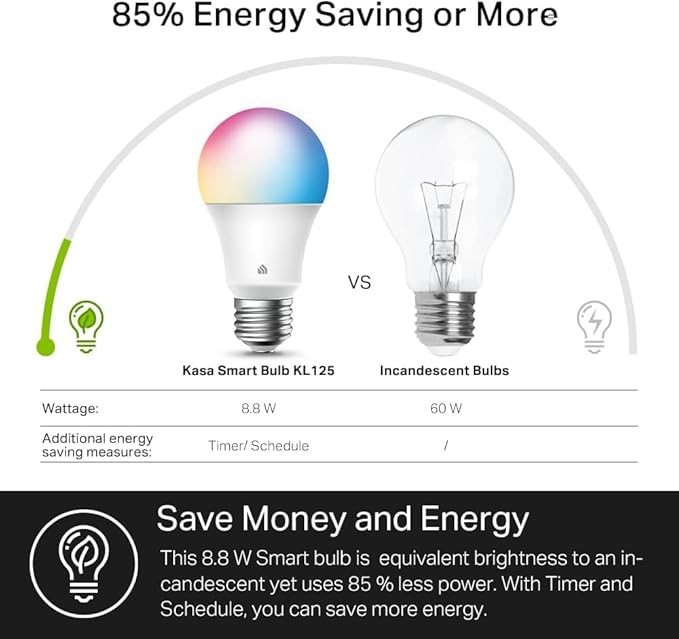 Drive down energy consumption without losing quality (60 W equivalent). Use timer or schedules to set your lights to automatically turn on and off whenever you want, such as waking up with a soft glow in the morning with sunrise offset.Trusted & Reliable: Kasa is trusted by over 6 Million users. UL certified for safety use. 2-year warranty. Require 2.4GHz Wi-Fi network connection. Operating Humidity 10%~90%RH, Non-condensing