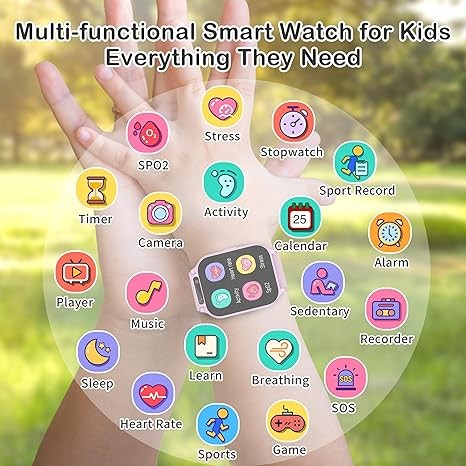 ✅【Newest Upgrade Kids Smart Watch】This multifunctional smart watch for kids with monitors health (sleep/heart rate/blood oxygen/) and safety (SOS alerts/sedentary/drink water reminder). Features 100+ sports modes, camera, music, video player & recorder, custom watch face, puzzle games, voice assistant, bluetooth calls, audiobooks & learn cards. Including pedometer, calculator, class mode, torch, timer, alarm etc, which can bring convenience, fun and unique new experience to children in their lives.