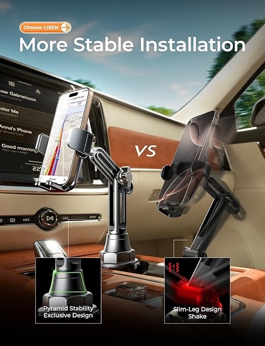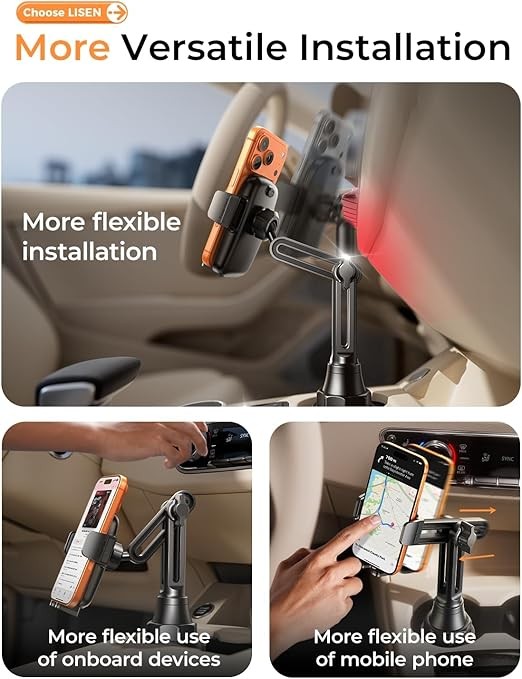 [3ND GENERATION]: LISEN is committed to addressing your feedback on our previous generation car cup phone holder. We understand that customers need to adjust the use distance from front to back in actual use, and that the base is too big for a smaller car cup holder. We have upgraded a new mobile phone holder for your car, The base can adapt to smaller car cup holders. And which has more directional adjustment stiffeners, stronger clamping arms, and a larger and more stable base. We have upgraded the innovative car cup mobile phone holder. Compatible with 99% of cars: BMW, Ford, Toyota, trucks, golf carts,Pickup truck, etc