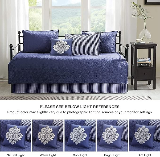 Madison Park Cotton Daybed Cover Set-Double Sided Quilting Classic Cottage Design All Season Bedding with Bedskirt, Matching Shams, Decorative Pillow, 39"x75", Quebec Navy 6 Piece