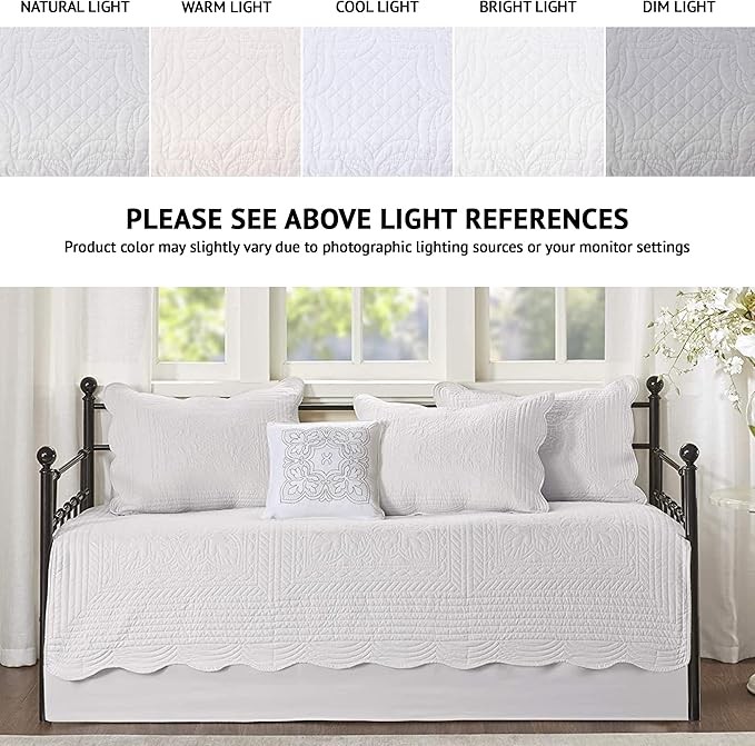 Madison Park Daybed Cover Set Damask Quilted Cover for Daybeds, All Season, Pre-washed Cotton-Filled Coastal Bedding with Scallop Edge, Shams, Bedskirt, Décor Pillows, Tuscany, White, 39"x75", 6 Piece