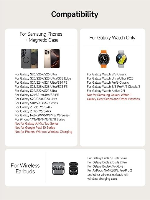 Magnetic Charging: Use a standard magnetic case for your Galaxy phones. **NOTE: Avoid regular cases, cases with ring stand or metal ring on the back, cases with external magnetic rings, and magnetic wallet cases.**