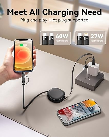 ⚡【5 IN 1 Multi Charging Cable for Travel Essentials】: MINLU Cost-Effective 5 in 1 multi usb cable can satisfy multiple charging demands and PHONE STAND FUNCTION for you. Offers 5 different connectors combination: C To L Port ( PD 27W), C To C Port (PD 60W), A To C Port, A To L Port and USB to USB C adapter. Easy to switch between USB C/ Lightning/ USB A Ports. Available anytime, anywhere. Hot-plug supported. You can carry this retractable multi charger cable anywhere, perfect for travel or sharing with friends.