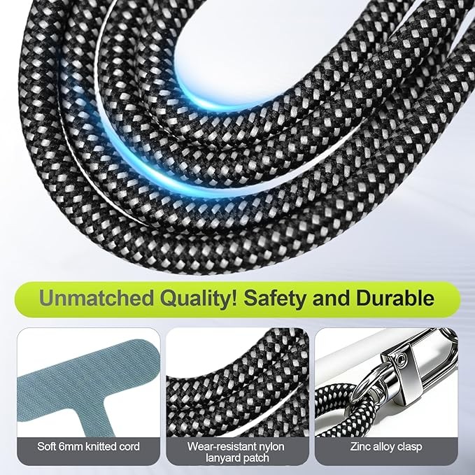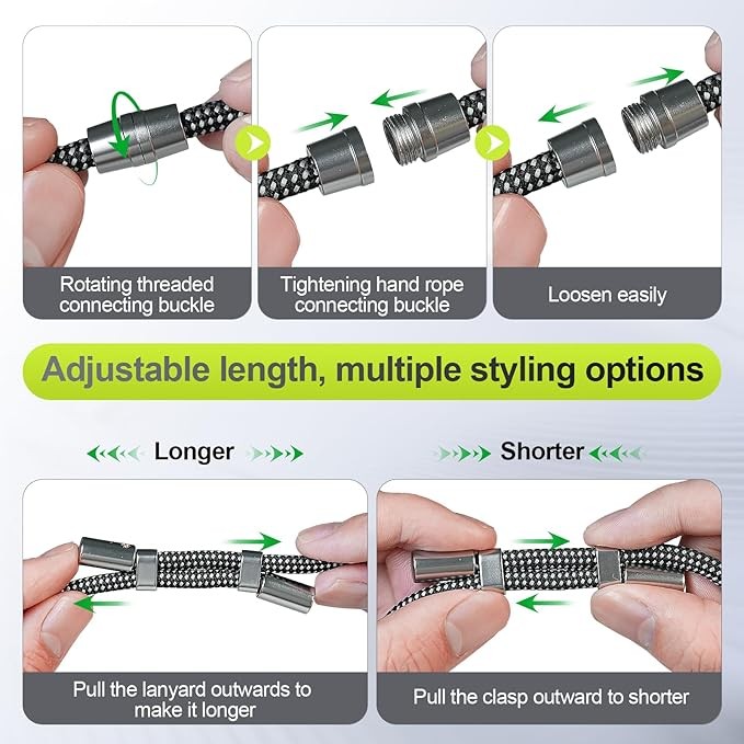 Adjustable Length: You can adjust the length from 17.5 inches to 32 inches of the phone lanyard as you needed, suitable for various height groups, whether children, adults, men, or women, it can be easily used. The rope has a thickness of 8mm and is equipped with a sturdy and durable zinc alloy buckle and nylon gasket. When you travel, hike, climb mountains, cycling, take your child, or shop, it can effectively protect your phone from theft or accidental fall damage